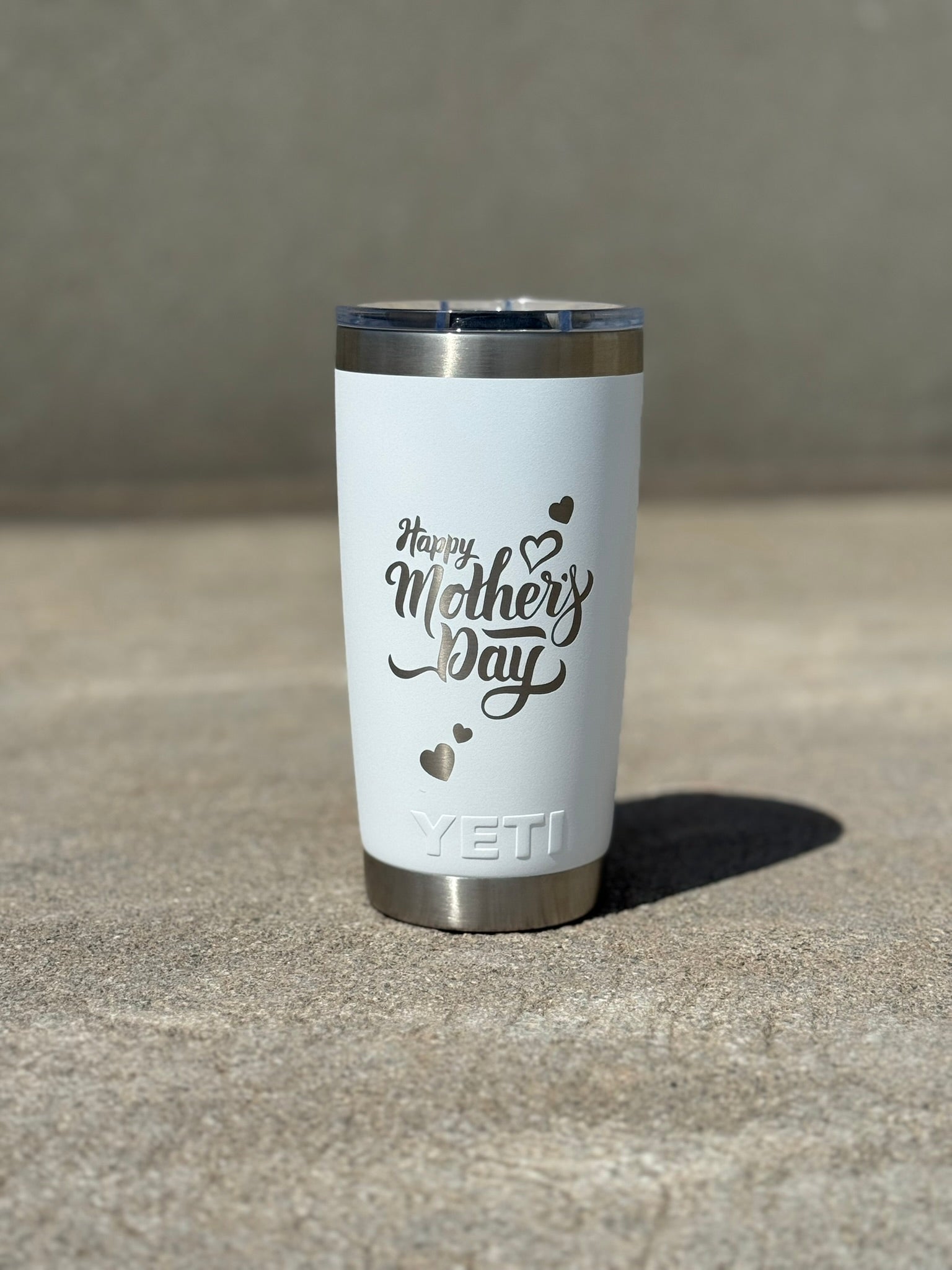 One of a kind custom engraved Yeti just in time for Mother's Day. Any tumbler that's coming along for the ride needs to be tough enough to keep up. Our Rambler® 591 ml / 20 oz. is made from durable stainless steel with double-wall vacuum insulation to protect your hot or cold beverage at all costs. Like the entire Rambler Family, the 591 ml Tumbler and its lid are dishwasher-safe for easy cleaning. While the magnet on the included MagSlider™ Lid adds an additional barrier of protection for keeping drinks contained and preventing heat or cold from escaping, please note - this magnet component is not leakproof and will not prevent spills. Available in Stainless, Duracoat™ colors and Seasonal finishes.