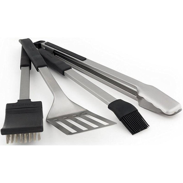 The Baron™ series tool set contains a turner, locking tong, basting brush and grill brush. Resin handles and stainless blades make up the core components. Grill brush features an integrated grime guard, while the remainder of the tools have a box design to improve rigidity.