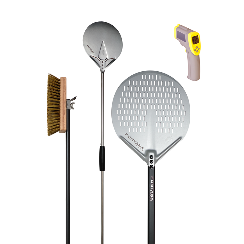 MADE IN ITALY - The Deluxe 4pc. Deluxe Accessory Kit is the perfect combination of essential tools to get the most out of your Margherita Gas or Mangiafuoco Gas Ovens. This kit also pairs well with our dual chambered models like the Gusto and Rosso. Each item in this kit will aid you in pinpointing temperature hot spots, even cooking, ease of transfer of pizza in and out of the oven. Included in the kit is a: brass-bristled brush, turning peel, turning peel, & infrared thermometer.