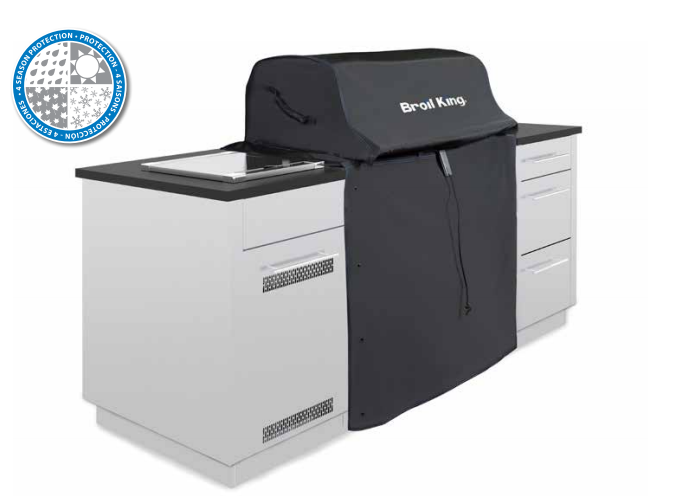 Protect your new grill from rain, snow and windy conditions. This cover is constructed from a durable and weather resistant PVC outer shell with a polyester lining. Includes hook and loop closures, polyester handles on each side for easy removal, and the Broil King logo screened onto the front.