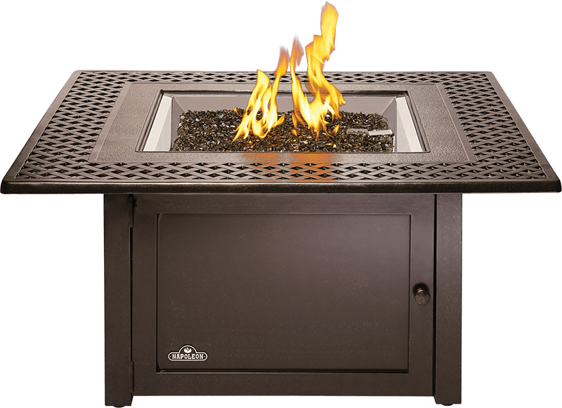 • Enjoy the luxury and warmth of a fire pit with the ease and security of using natural gas or propane with the Kensington Square Patioflame® Table. A topaz glass ember bed reflects the flame's light, creating a comforting glow that you can further customize with additional colored glass. Bring this table to where the action is, or create a cozy nook for intimate conversations. The Kensington Square Patioflame® Table is made of rust-resistant aluminum, is lightweight and weather resistant. The rustic bronze finish and intricate woven pattern gives a feeling of subtle luxury and comes with a matching burner cover to extend your table surface area when not burning.