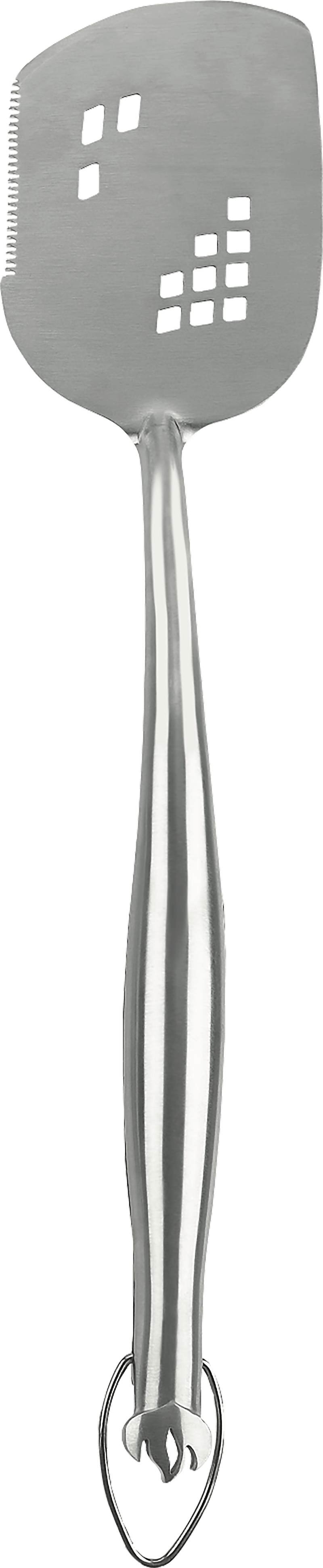 Napoleon PRO series stainless steel spatula with oversized head for firm control that will last. This oversized spatula is built to last, guaranteed not to rust even for the most frequent griller. Comes with a serrated edge for trimming the food right on the grill.