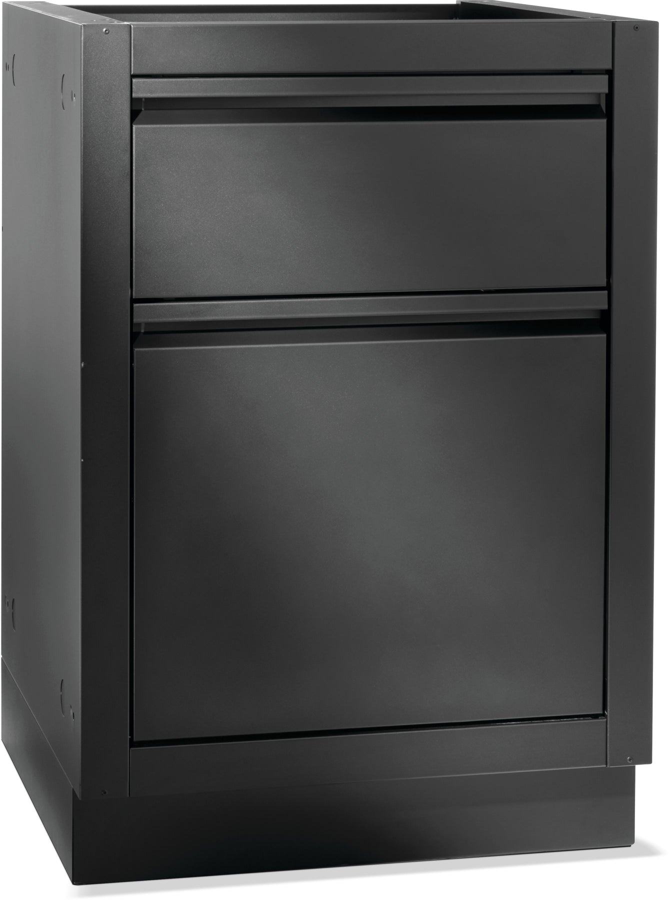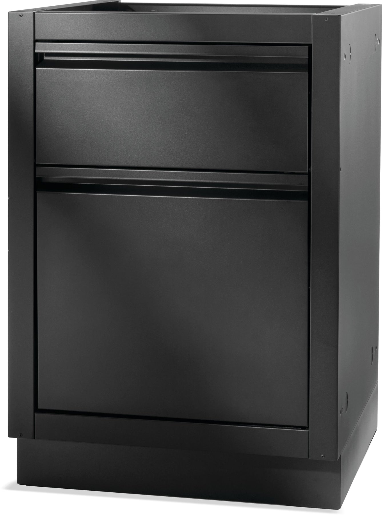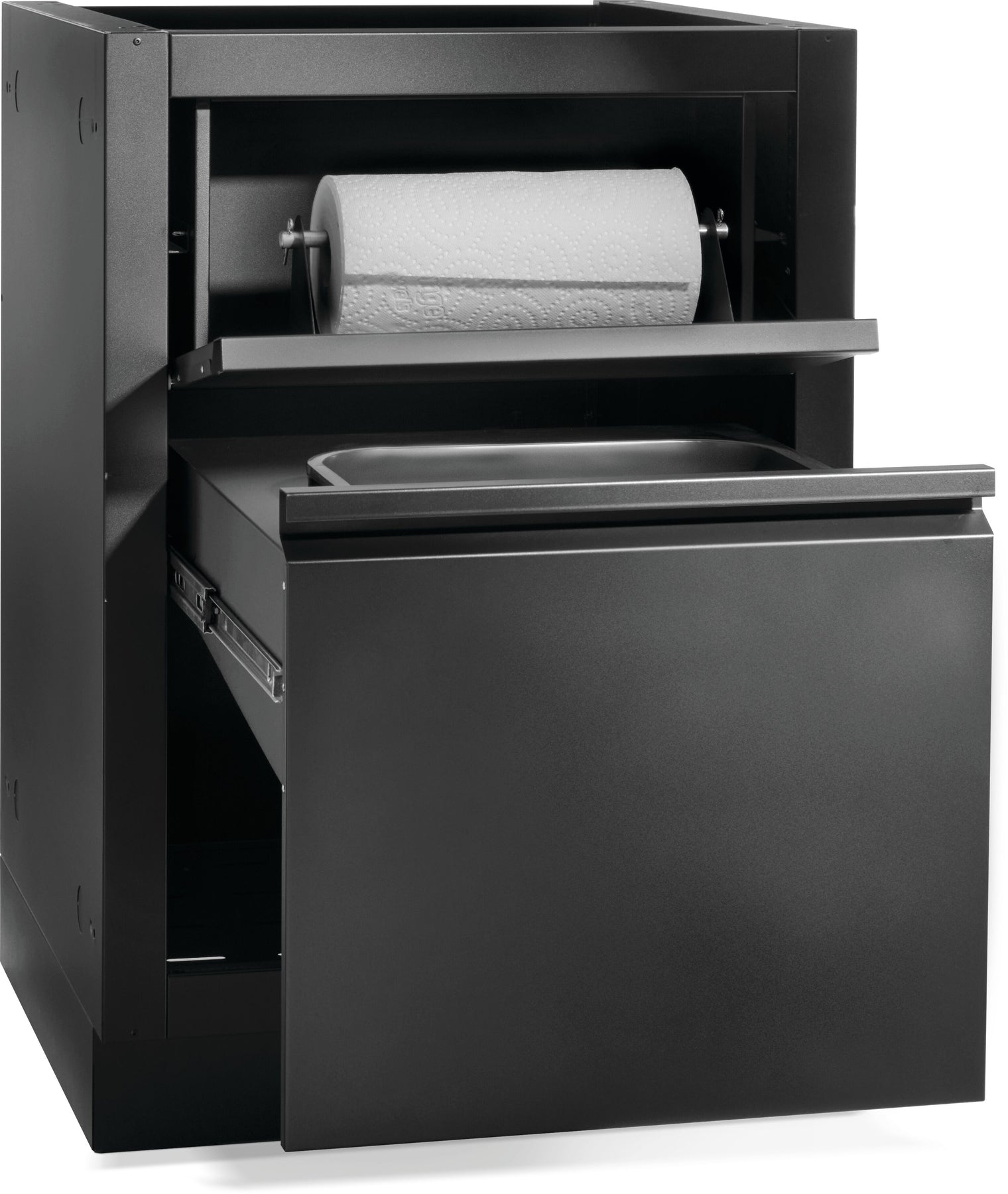 Things can get messy even in the perfect kitchen. Make cleaning up your outdoor kitchen OASIS® easy with the OASIS® Waste Drawer Cabinet. Featuring a soft-close door with garbage pull out with a removable waste bin, and a flip down drawer with paper towel holder. This matte black colored, powder coated, galvanneal cabinet features increased durability. Installation is a breeze with knockouts for gas and electrical. Levelling feet ensure a balanced surface, even if your patio isn't perfectly level. Add this cabinet to the perfect outdoor kitchen OASIS®, along with your choice of grill head and under grill cabinet. *Countertop not included