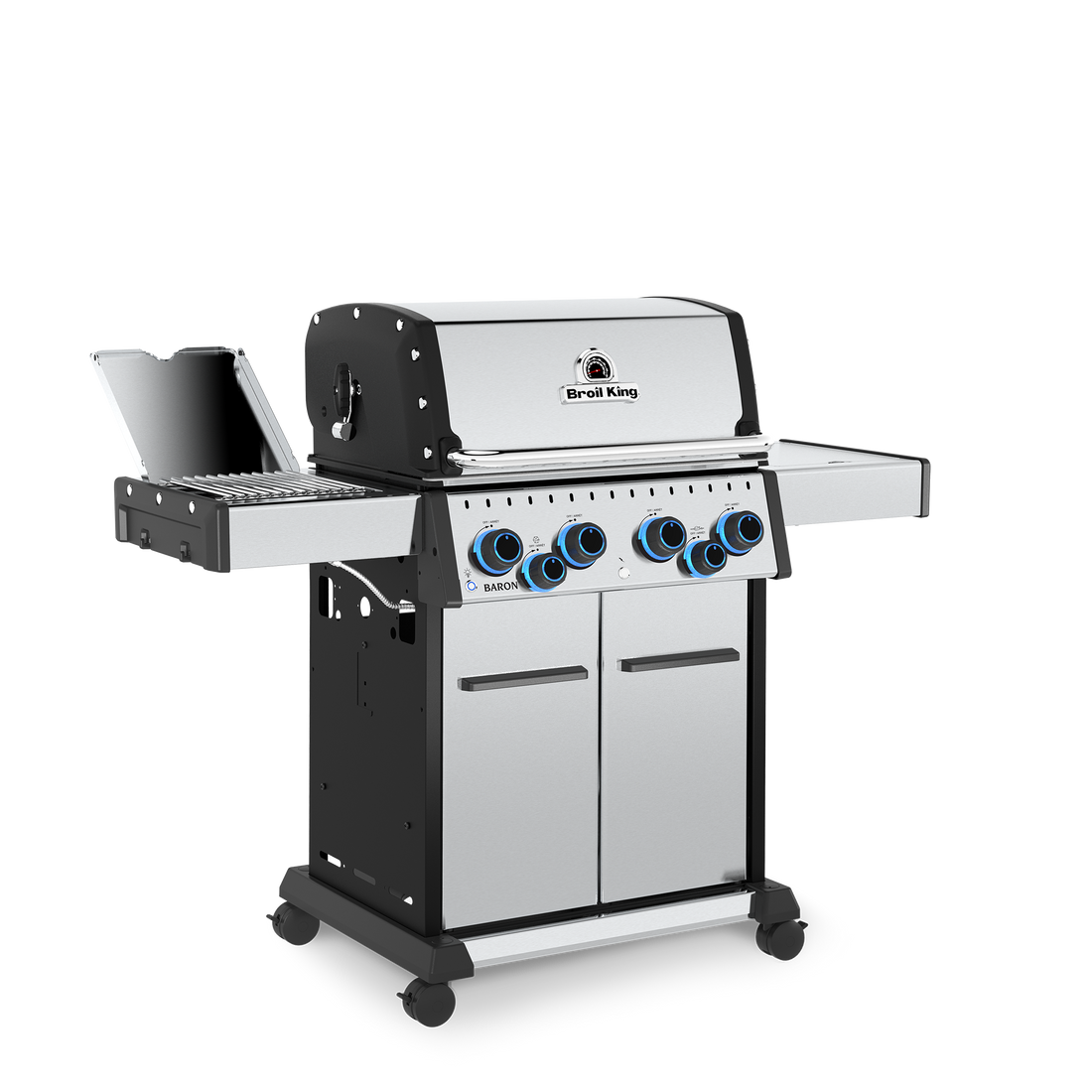 The Baron S 490 Pro IR delivers reliable power and performance in a sleek stainless steel package. With a 630 Sq. in. total cooking surface and 4 Dual-Tube burners producing 40,000 BTUs, it’s built for everyday grilling or weekend feasts. The 10,000 BTU infrared side burner sears steaks to perfection, while the 15,000 BTU rear burner with premium rotisserie kit expands your menu and capabilities. The reversible solid stainless steel V-Grids offer versatility, featuring a pointed side for perfect sear marks and a V-Channel side to capture drippings and juices for continuous basting. The Flav-R-Wave cooking system delivers even heat and vapourizes juices, infusing them back into your food for unmistakable barbecue flavour. Convenience comes standard with illuminated control knobs, electronic ignition, and drop-down side shelves. This grill is built to last and is backed by a 15-year top-to-bottom warranty.