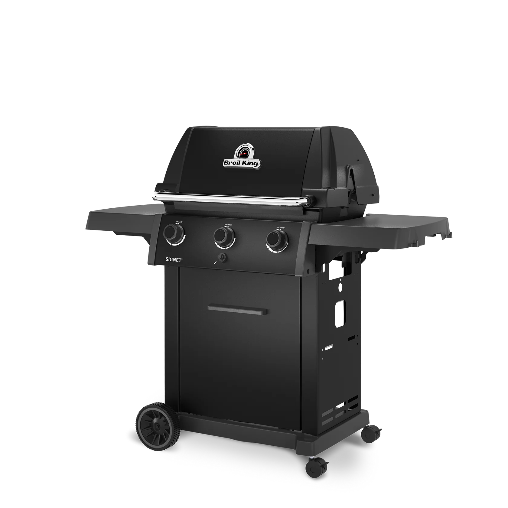 The Signet™ 320 Shadow features 635 sq. in. total cooking space including porcelain coated warming rack, heavy-duty cast iron cooking grids, stainless steel Flav-R-Wave™ cooking system, 3 stainless steel Dual-Tube™ burners, stainless steel drop-down side shelves and enclosed cabinet base.